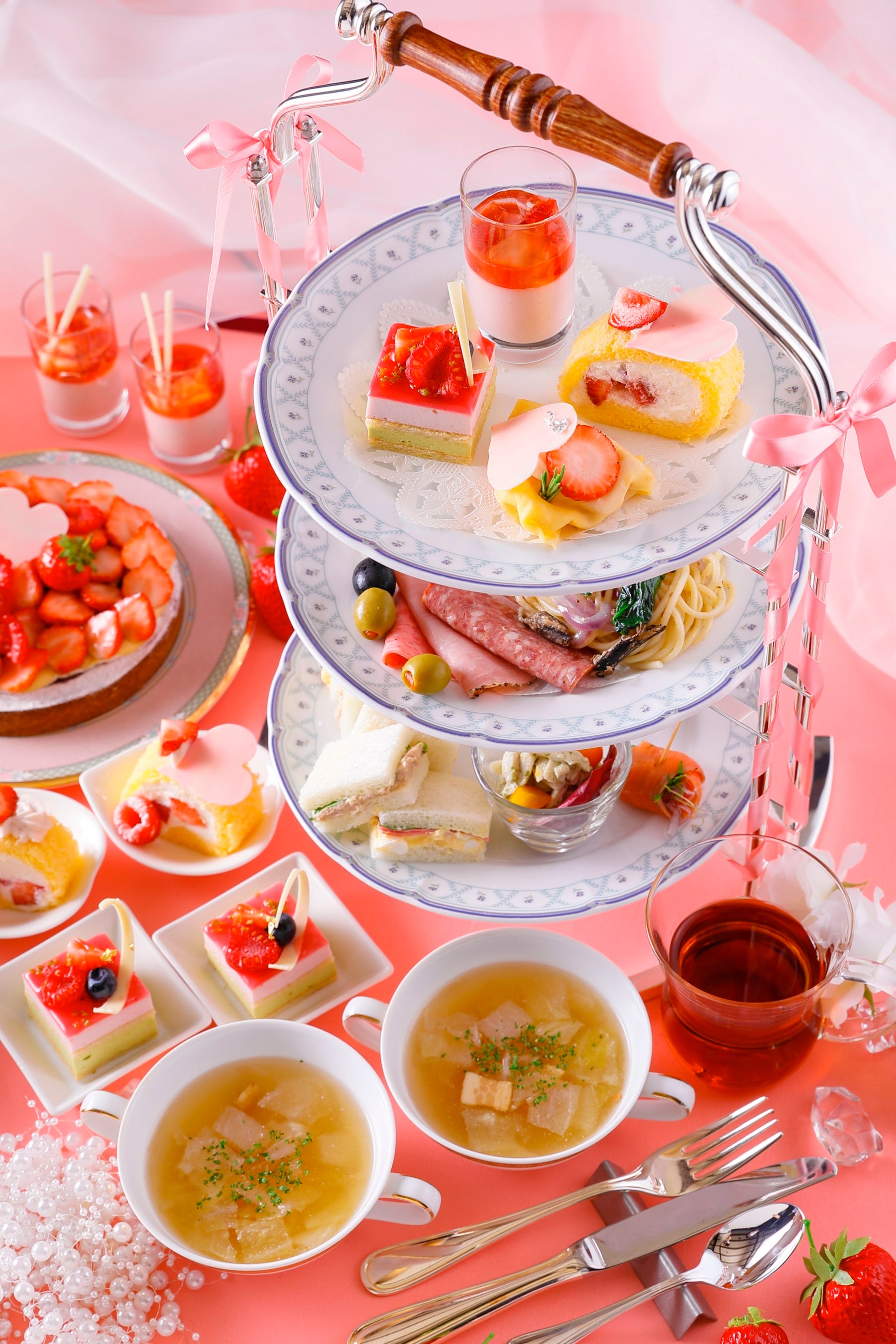 ホテルの象徴にもなっている開放的な吹き抜けが心地よいアトリウムラウンジ「グリンデルワルド」では、 季節ごとにテーマを設けたナイトスイーツブッフェを開催しています。1~3 月は、旬を迎える“いちご”が主役です。店内に広がるいちごの甘酸っぱい香りと、散りばめられたハートモチーフが創り出す空間に、キュートなストロベリースイーツが勢ぞろいします。また、スイーツと一緒に楽しんでいただきたい紅茶には、春らしいフレーバーを10種類セレクトしました。ご注文を受けてから1カップずつ丁寧に淹れた香り豊かな紅茶を、何杯でもお召し上がりいただけるよう飲み放題でご提供いたします。