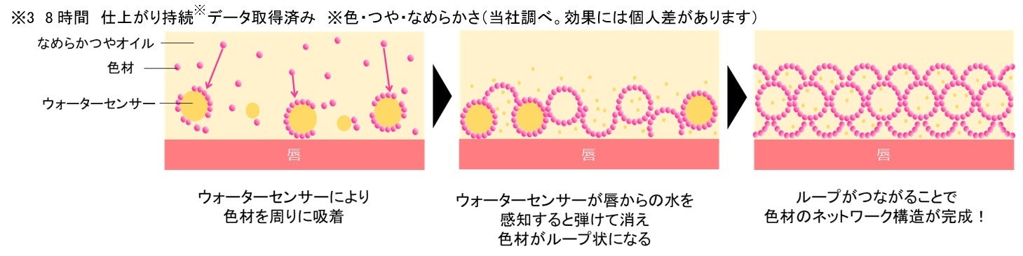 口紅を塗布すると、油性成分で構成されるウォーターセンサーが口紅内に点在している色材を選択的に集めます。唇の水分を感知するとウォーターセンサーが弾けて消え、色材のループを形成します。ループがつながることで色材の強力なネットワーク構造が完成します。色材一つ一つが離れにくく唇にぴったり密着するので、軽いつけ心地ながら落ちにくく、つけたての色・つやが続きます※3。