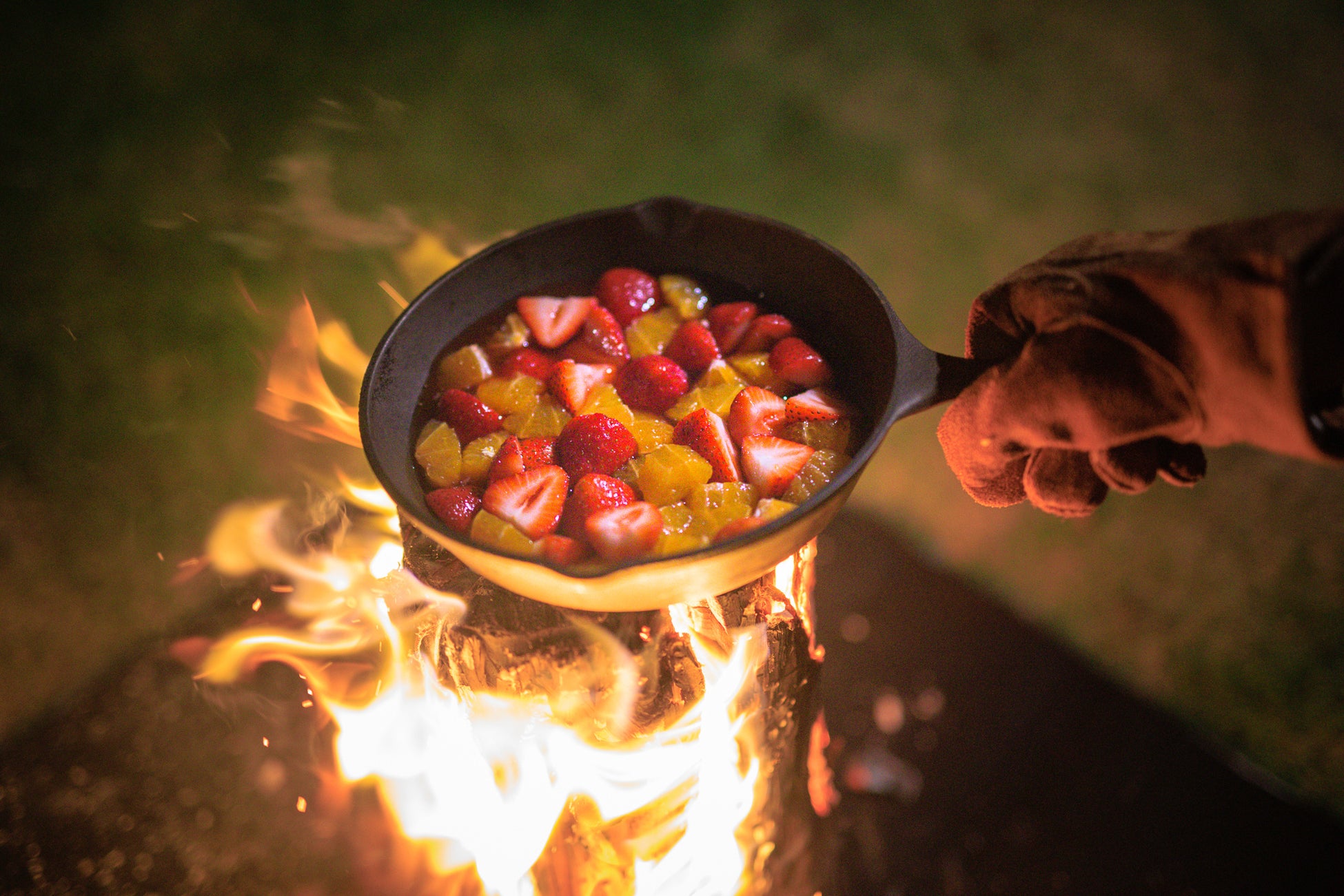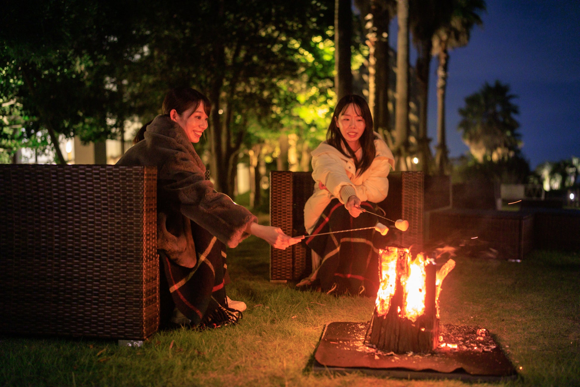 「焼きマシュマロ」は焚き火のそばでマシュマロをじっくりと時間をかけて焼くことで、外はこんがり、中はとろけるような食感を楽しむことができます。「キャラメル風味のフルーツコンポート」は、いちごと大磯みかん、キャラメルソースをスキレットに入れて焚き火で煮込み、アイスクリームと一緒に楽しむ甘みと酸味が絶妙なスイーツです。道具や材料は全てホテルで用意するので、手ぶらで楽しめます。
