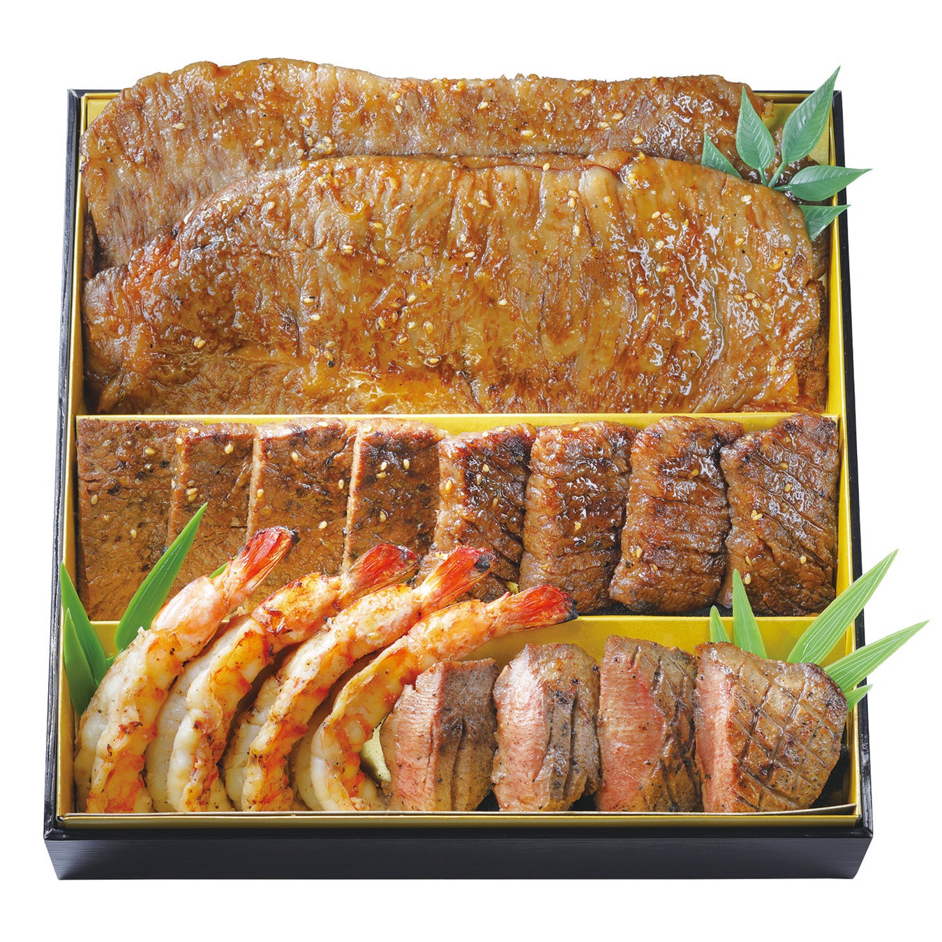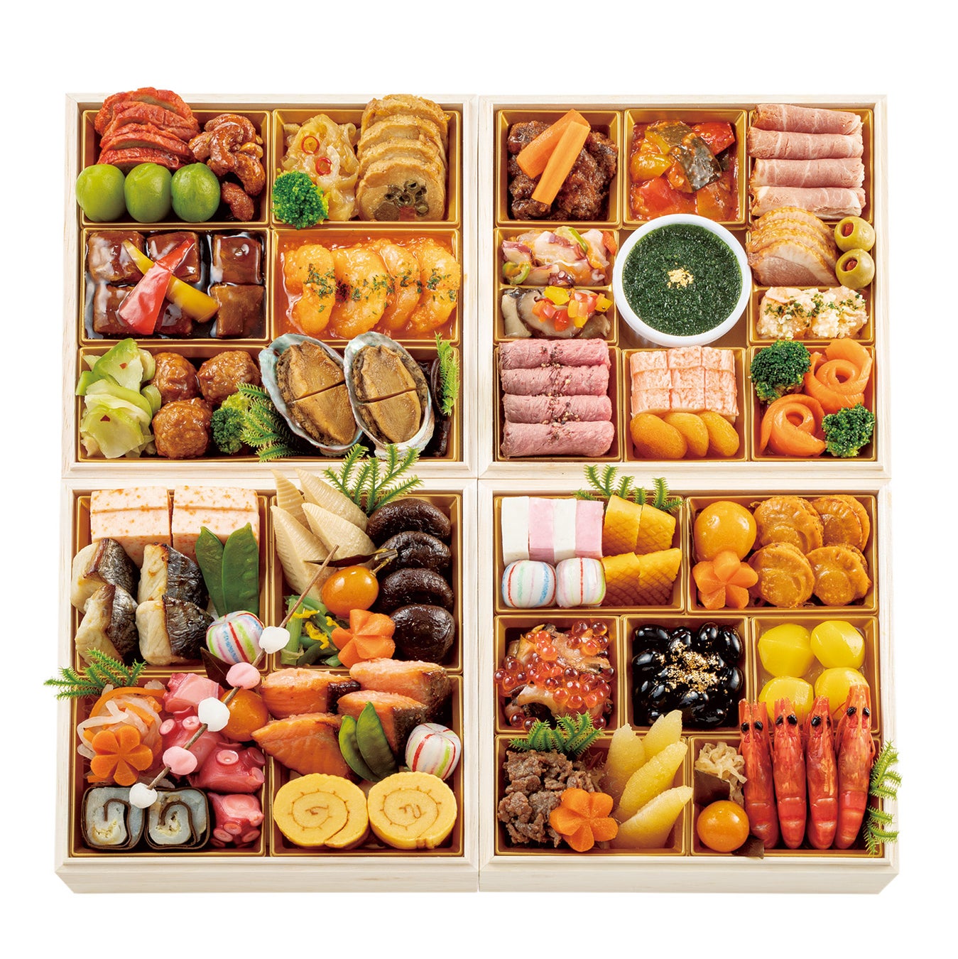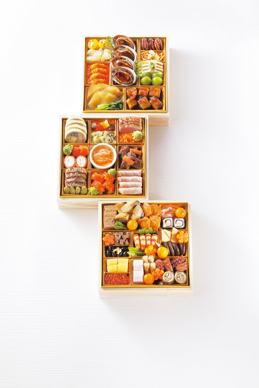 和風が二段、洋風一段、中華一段。帆立の雲丹焼、ローストビーフ、海老チリソースとバラエティー豊かに詰め合わせて。