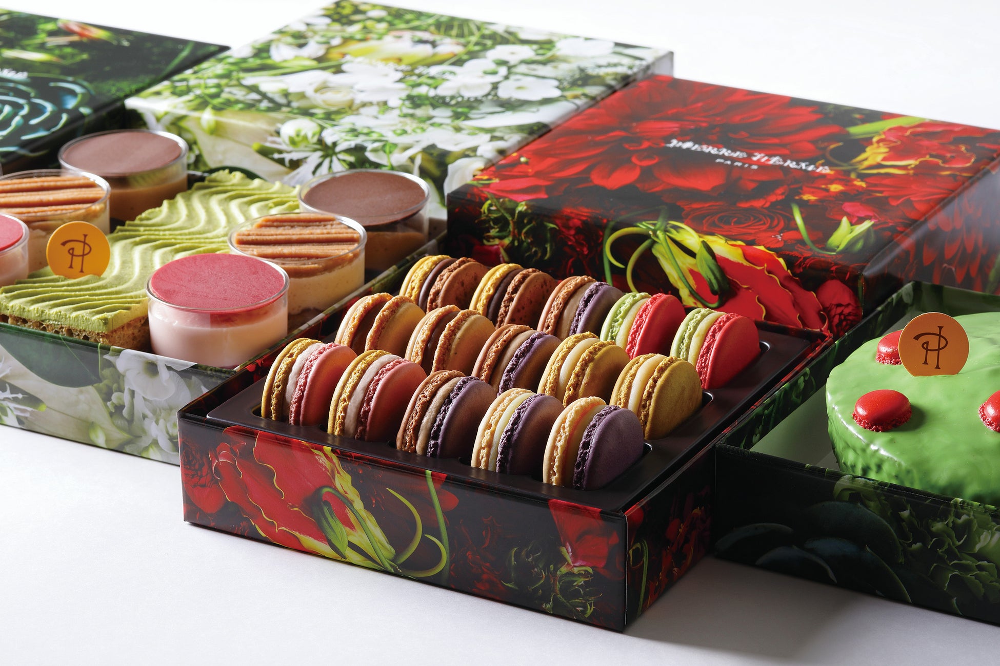 ピエール・エルメ・パリから、人気のスイーツおせち、五感を刺激するスイーツを詰め合わせ、三段に重ねました。