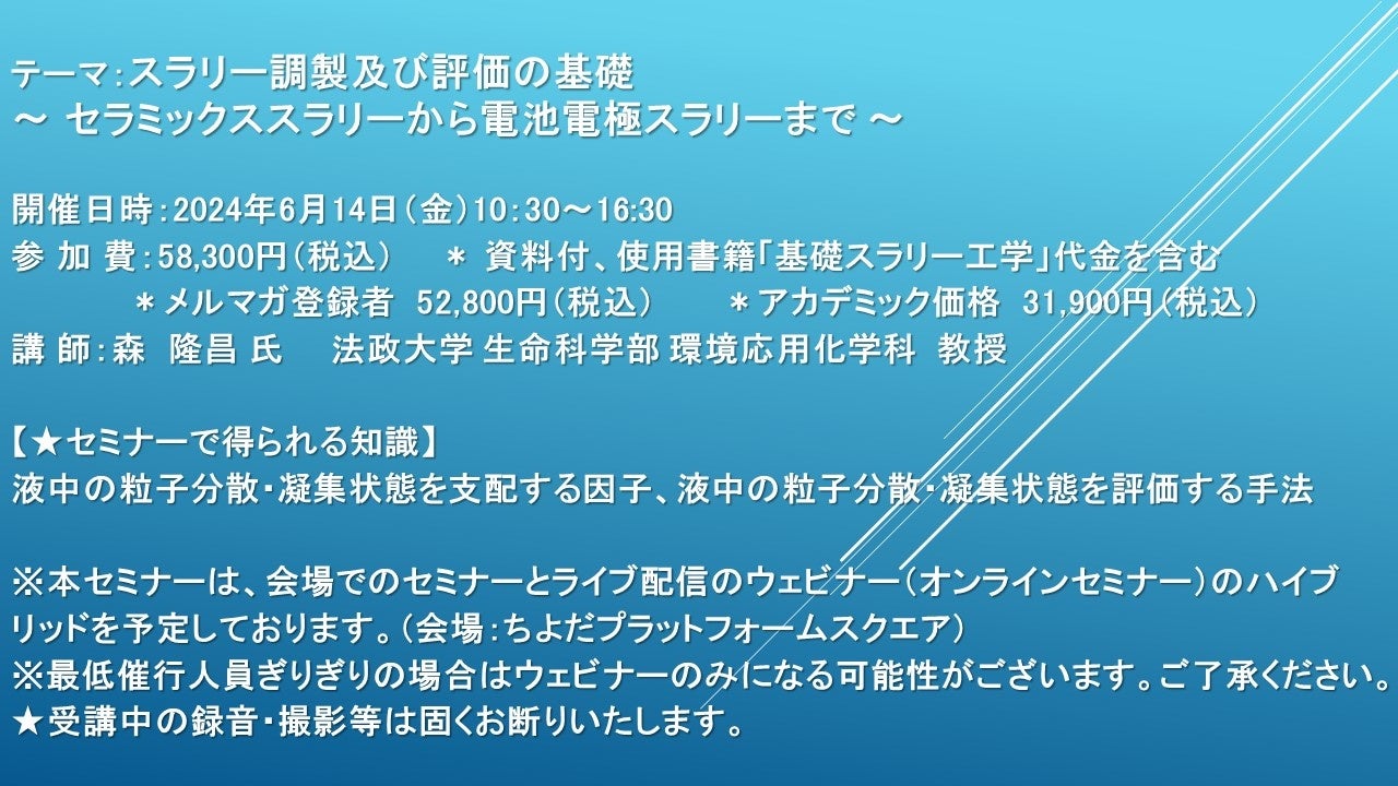 【会場/ライブ配信ハイブリッドセミナー】スラリー調製及び評価の基礎 ~ セラミックススラリーから電池電極スラリーまで ~ 6月14日(金)開催 主催:(株)シーエムシー・リサーチ