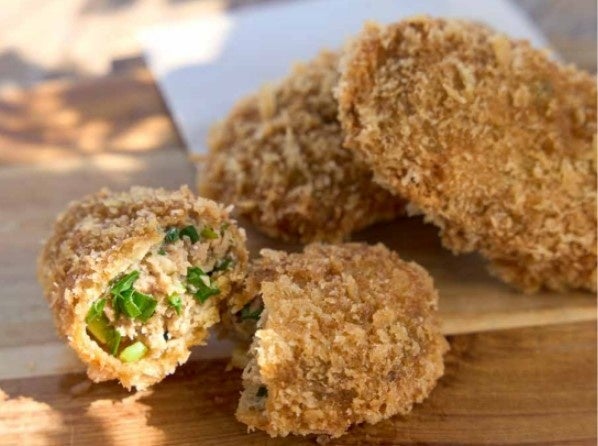 にらの名産地・熊本県甲佐町の名物“にらメンコ。”。特産のにらと黒毛和牛・国産豚の合挽肉を使ったメンチカツです。揚げたてはジュワっと肉汁があふれて、香ばしいにらの風味が広がるおいしさ。