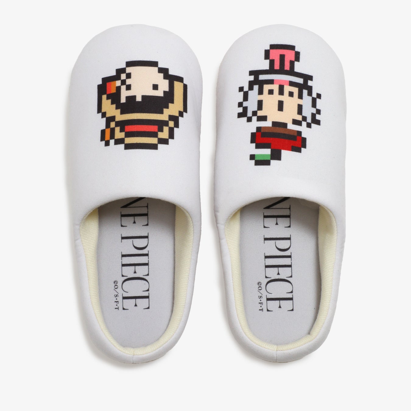 ピクセルアートでデジタルにルフィとベガパンクがデザインされたルームスリッパ。