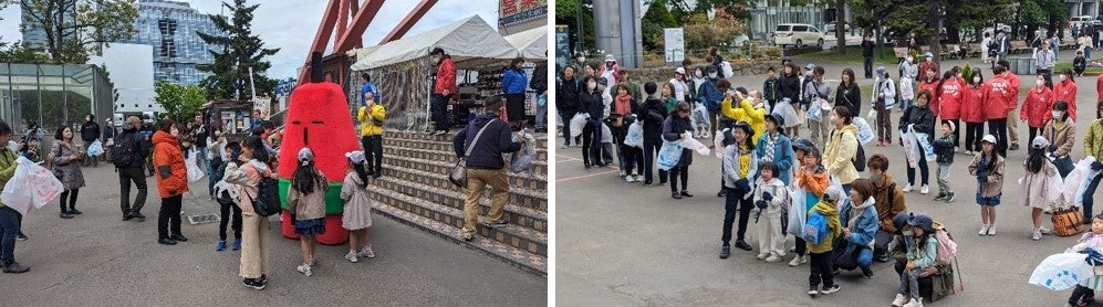 ・開催概要:参加者が札幌テレビ塔の非公式キャラクター「テレビ父さん」とツルハドラッグのマスコット「つるくん」「つるちゃん」と一緒に札幌・大通公園でごみ拾い。