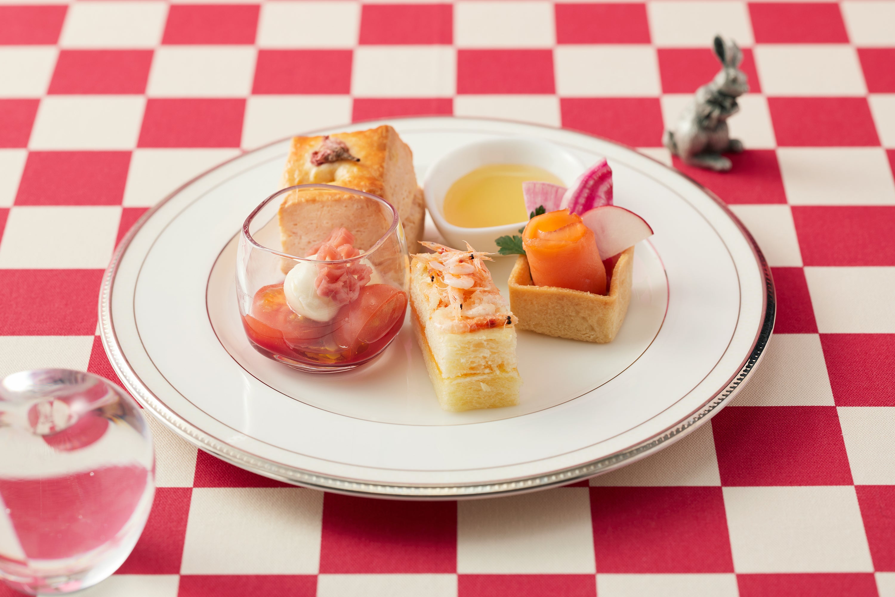 上段は、甘酸っぱい味わいと重なる層が美しい「フランボワーズのオペラ」や香りが特徴的な「桜のフィナンシェ」など、春らしい色合いと香りが口の中でほのかに広がる上品なスイーツをお楽しみいただけます。中段は「桜のムース」や、桜餡とクリームのコンビネーションが絶妙な「桜餡の羊かん」など、日本の春を象徴する桜色の春らしさ満点の華やかなスイーツをご用意しました。下段のセイボリーには、「桜海老のクロックムッシュ」や「フランボワーズのカプレーゼ」など、意外な組み合わせが楽しめる本格派のセイボリーを揃えております。