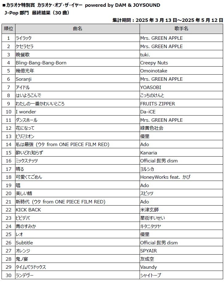 2025年3月13日~5月12日の集計期間でエントリー作品(J-Pop部門/演歌・歌謡曲部門 各30曲)の中から「DAM」および「JOYSOUND」で最も歌われた楽曲を各部門の最優秀作品としました。