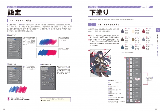 購入者限定のダウンロード特典として、CLIP STUDIO PAINTで使用できる「レイヤー分けされた完成イラストデータ」や「カスタムブラシ」「カスタムカラーセット」「練習用線画」も付くので、プロのイラストを直接確認しながらメイキングを読み進められます。満足度200%の豪華イラストデータと詳細なメイキング解説で、テクニックへの理解がより深まります!