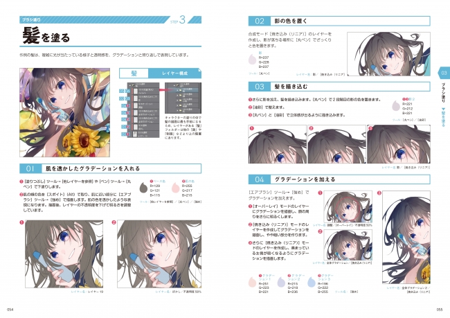ブラシ設定/髪を塗る/瞳を塗る/肌を塗る/仕上げテクニック