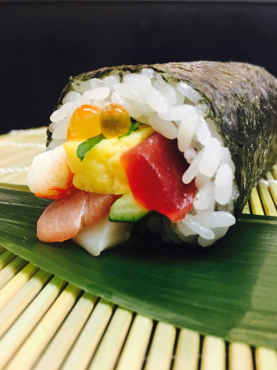 具材:天然本鮪・車海老・本ずわい蟹・子持ち昆布・ますこ・おぼろ・胡瓜・かんぴょう・煮椎茸・煮穴子・カステラ玉子