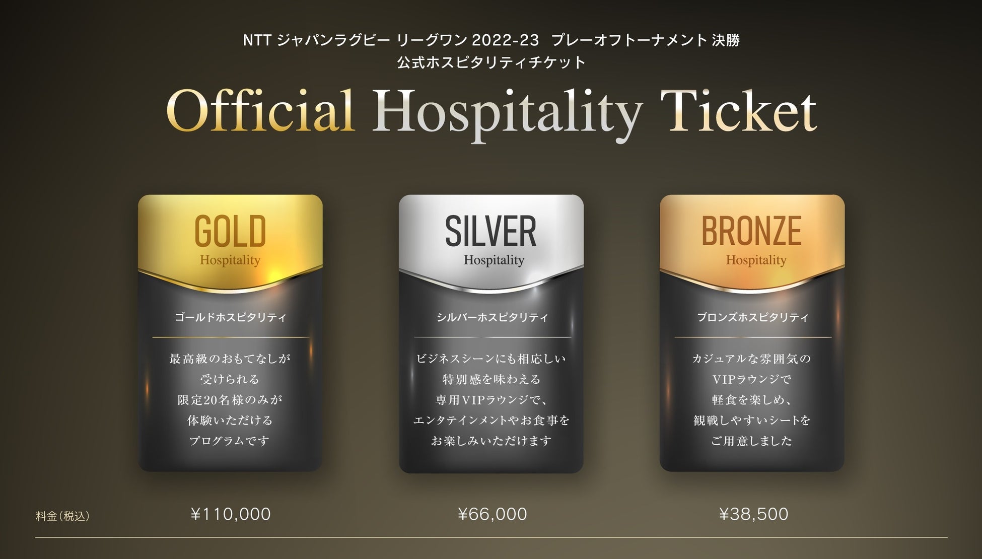 NTTジャパンラグビー リーグワン2022-23プレーオフトーナメント決勝では極上体験が堪能できる公式ホスピタリティチケットを3種類ご用意しました。限定20名様のための専用VIPラウンジで最高級のおもてなしを受けられるゴールドホスピタリティチケット、ビジネスシーンにも相応しい特別感を味わえる専用VIPラウンジでエンターテインメントと食事をお楽しみいただけるシルバーホスピタリティチケット、カジュアルな雰囲気の専用VIPラウンジで軽食を楽しめ、観戦しやすいシートをご用意したブロンズホスピタリティチケットと、どれも忘れられないファイナル観戦になることを約束します。