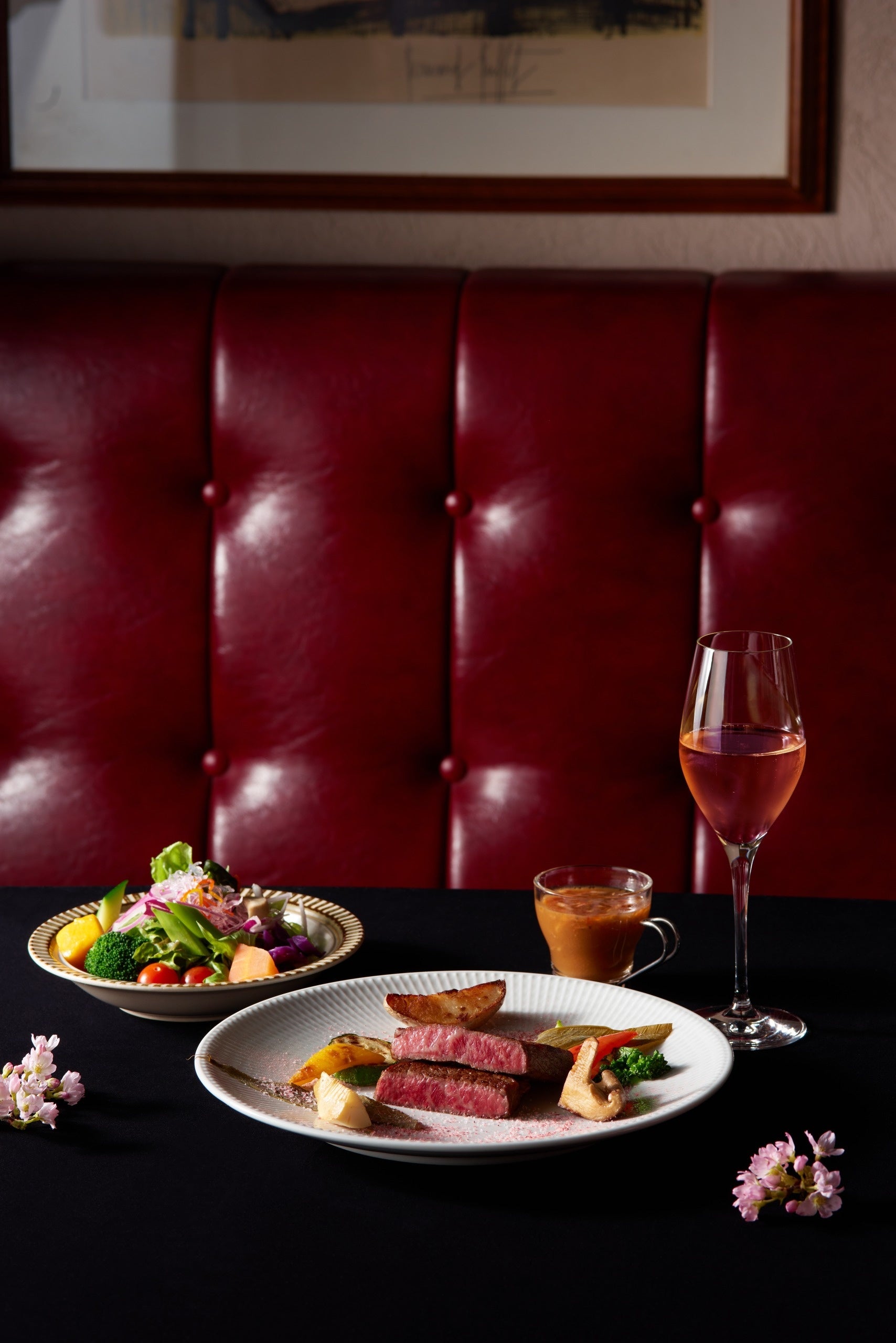 ホテルニューオータニ(東京)のステーキハウス「リブルーム」では、"幻の和牛"「尾崎牛」を主役に、たけのこ、菜の花など春の食材を使用した『春を彩る桜コース』を2024年4月7日(日)までの期間限定で販売いたします。卒業や進級・入学など、春のお祝いの席にも最適です。