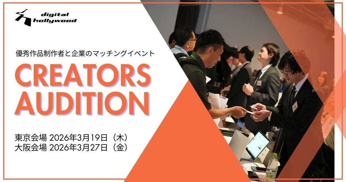 IT関連及びデジタルコンテンツの人材育成スクール[デジタルハリウッド] (運営会社:デジタルハリウッド株式会社、本社/本校:東京都千代田区、代表取締役社長兼CEO:藤井雅徳、学長:杉山知之)では、スクール在学期間中に優秀な作品を制作した受講生が発表を行い、企業の皆様との交流を行う場として「クリエイターズオーディション」を、東京と大阪の2会場で開催します。