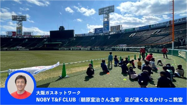 大阪ガスネットワーク株式会社の朝原宣治さんが主宰する「NOBY T&F CLUB」とコラボした教室を開催。トップアスリートの直接指導による、早く走るコツ、走る楽しさをお子様に伝える教室です。5歳から9歳までを対象に、阪神甲子園球場のグラウンド(外野・人工芝)で実施します。教室終了後は朝原さんのサイン入りメモ帳が5名様に当たるじゃんけん大会も実施予定です。