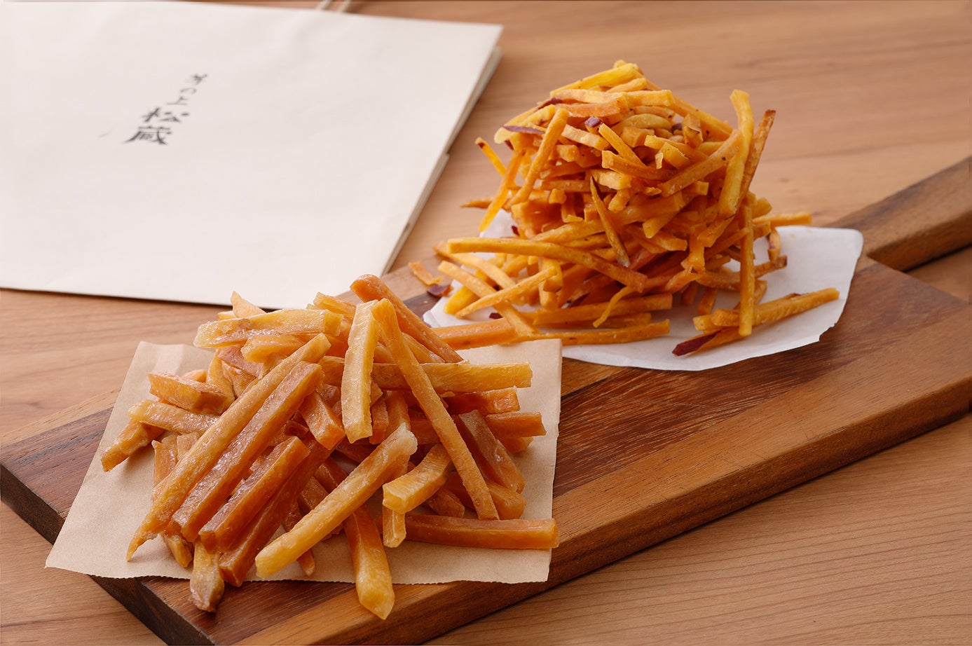 初出店の<芋の上松蔵(いのうえまつぞう)>は、スイートポテト専門店<松蔵ポテト>から生まれたさつまいもスイーツの専門店。東京・吉祥寺のお店で、自慢のスイートポテトと並ぶ人気商品が芋けんぴです。2年もの歳月をかけて理想の味を追求したという芋けんぴは、カリッとした歯触りのあとに、サクッ、もろっ、という独特の食感が楽しめる唯一無二のアイテム。揚げたてをそのままシロップにつける「甘」と、揚げたてを宮古島産の塩のみで仕上げた「塩」、どちらもさつまいも本来の味わいを引き出しています。さつまいもの旨みを凝縮した芋けんぴに、手が止まらなくなること請け合いです。