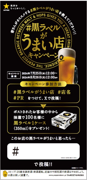 本キャンペーンは、期間中に「黒ラベルがうまい」と思う店の名前をキャンペーンハッシュタグとともにX(旧Twitter)で投稿したお客様のうち、抽選で100名に「サッポロ生ビール黒ラベル」350ml缶1ケースが当たります。