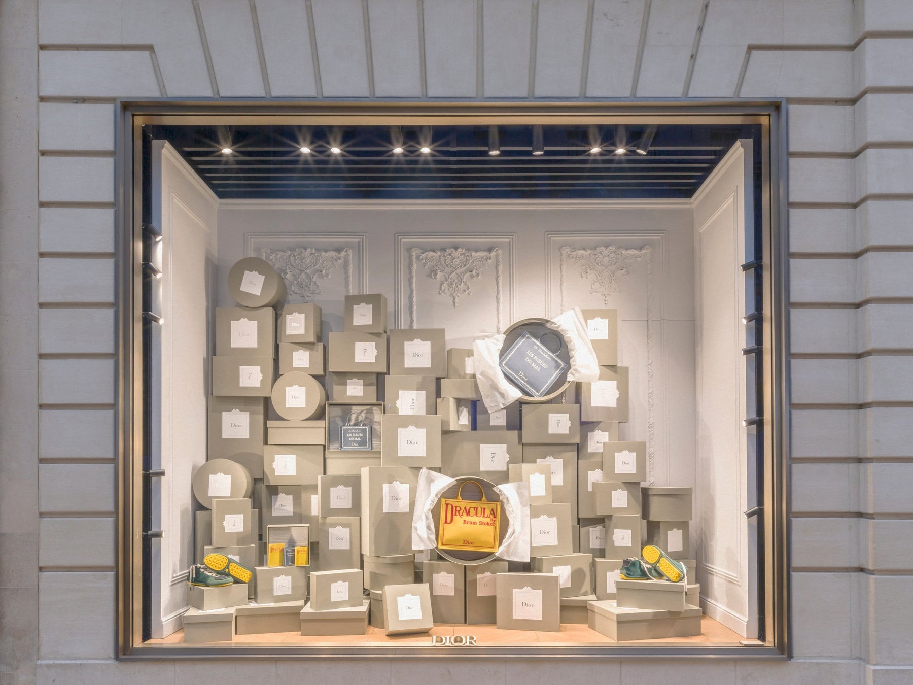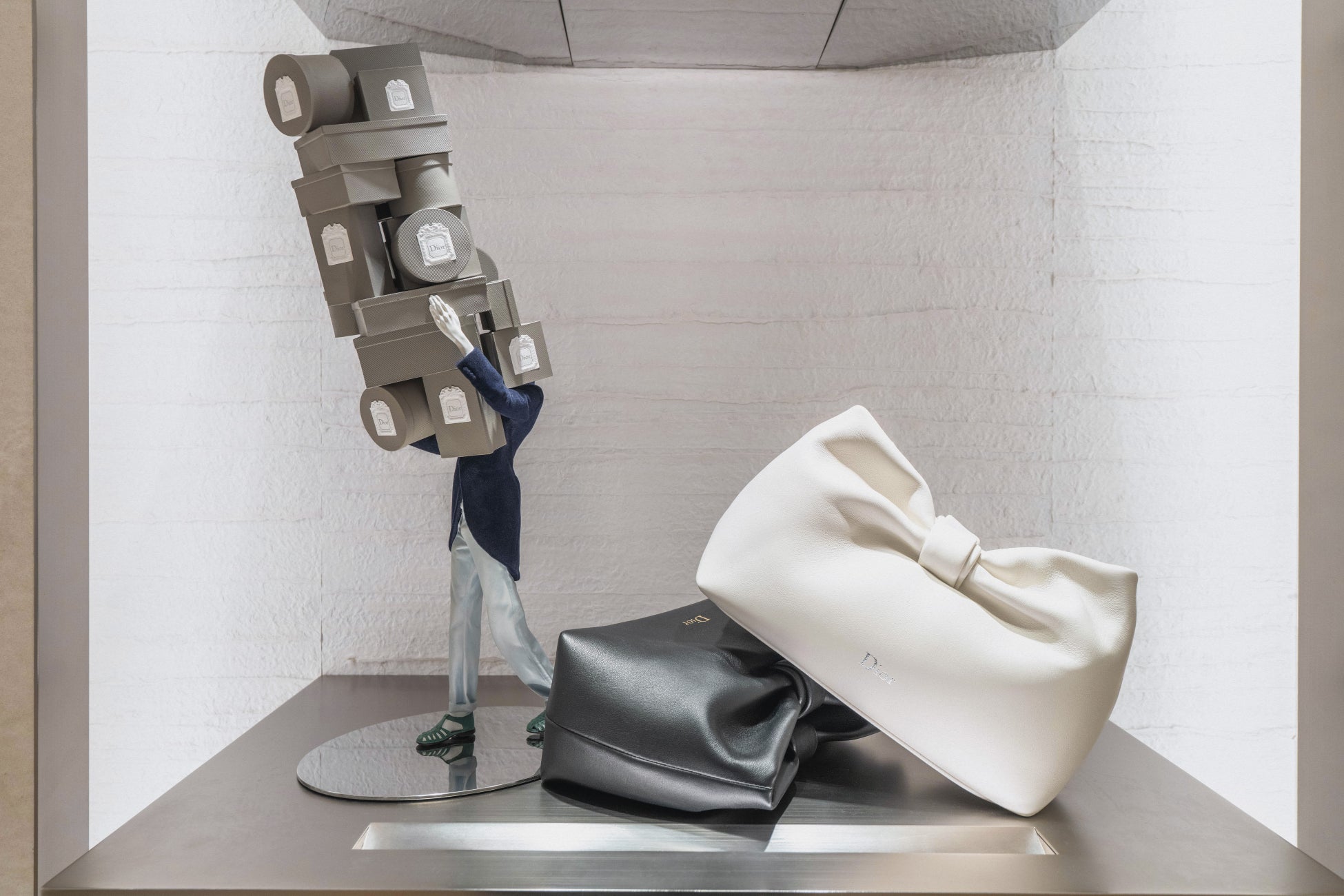 アーカイブへの楽しいオマージュである、没入型のディスプレイは、ディオールの最初のブティック「コリフィシェ」のボックスを遊び心たっぷりに再解釈しています。パリ本店「30 モンテーニュ」に敬意を表し、シグネチャーカラーであるグレーが空間いっぱいに広がります。ボックスはウィンドウディスプレイにあふれ出したり、目もくらむほど高く積み上げられ、いたずら好きなベルボーイがさながら綱渡りのように運びます。