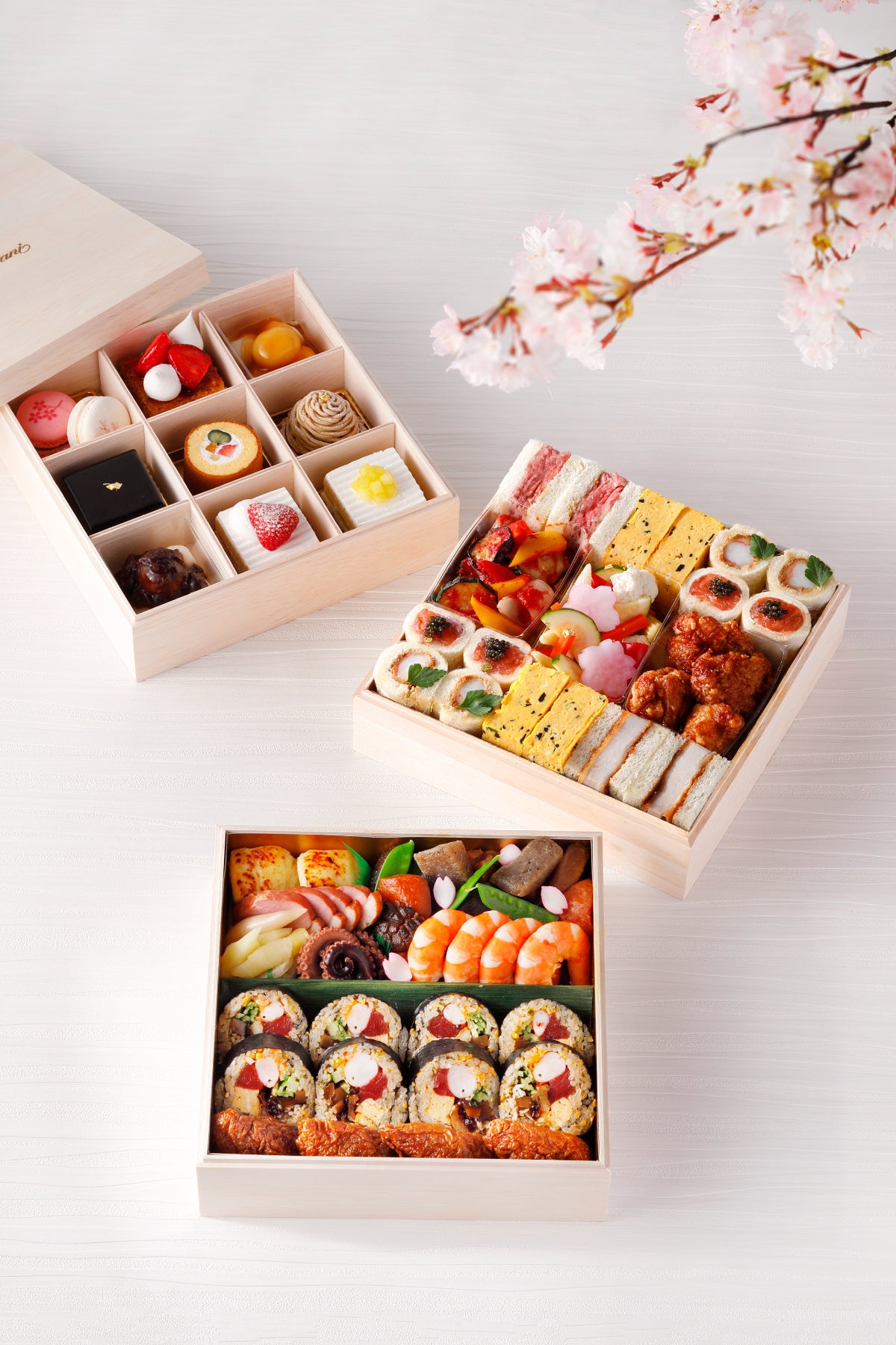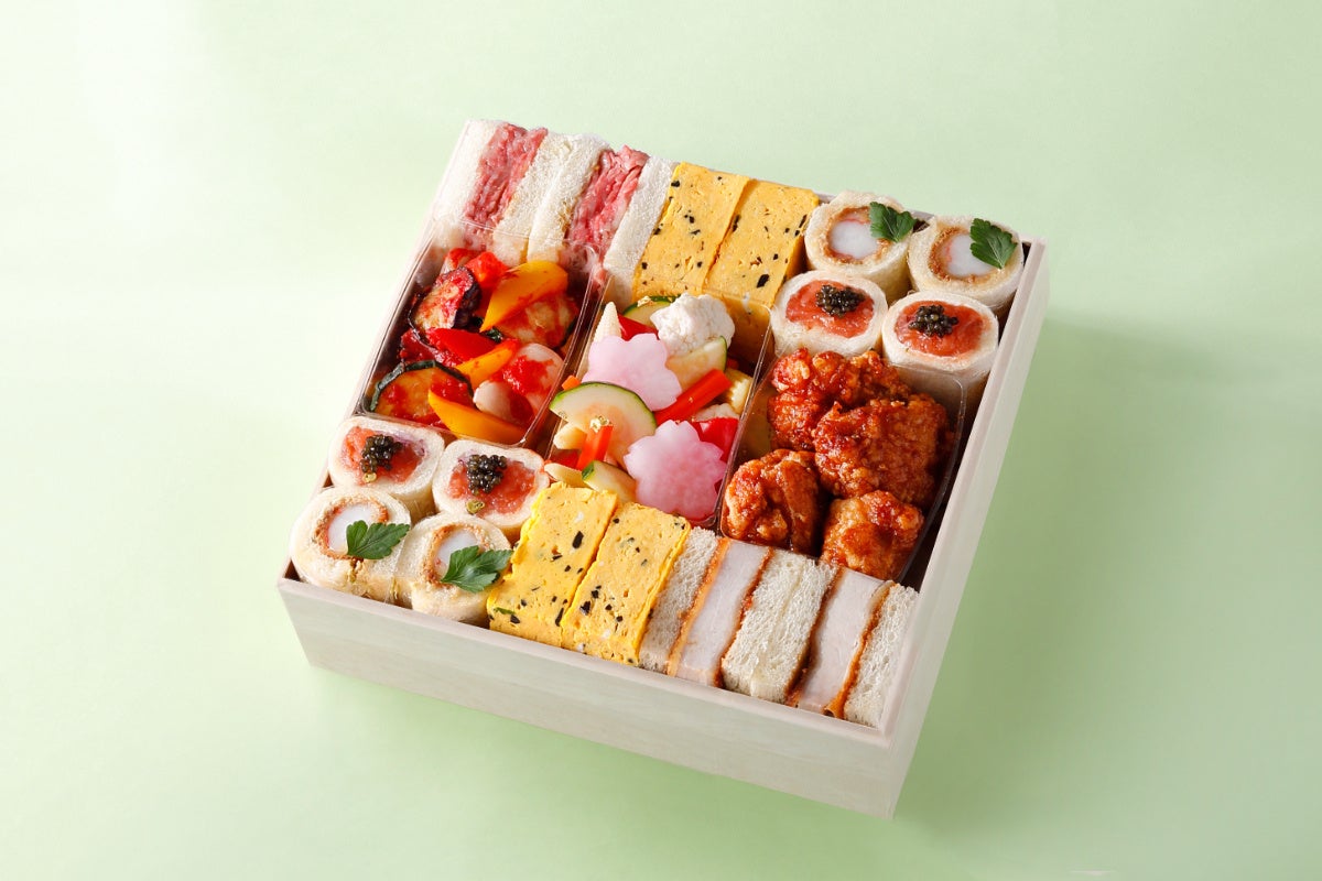 そこでホテルニューオータニ(東京)では、そんな華やかな席にさらに彩りを添えるべく、和・洋・スイーツそれぞれを贅沢に詰め合わせた珠玉のテイクアウトお重『春の彩り重』を販売いたします。「お花見の席をさらに美味しく、さらに華やかに」という想いを込めて、今年のお重は気の知れた仲間たちとサンドウィッチや太巻きを摘まみながらお愉しみいただけるような仕上がりに。店頭での受け取りほか、タクシーデリバリーでもご利用いただけます。