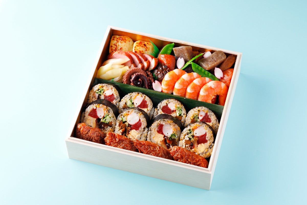 和風だしが効いた、あっさり味の春の筑前煮や福岡県糸島産の海老を使用した酒煮に、赤酢を使用した人気の太巻き「大谷」、油揚げを黒蜜で炊いていて甘味を感じられる稲荷寿司などを詰め込んだ一段です。