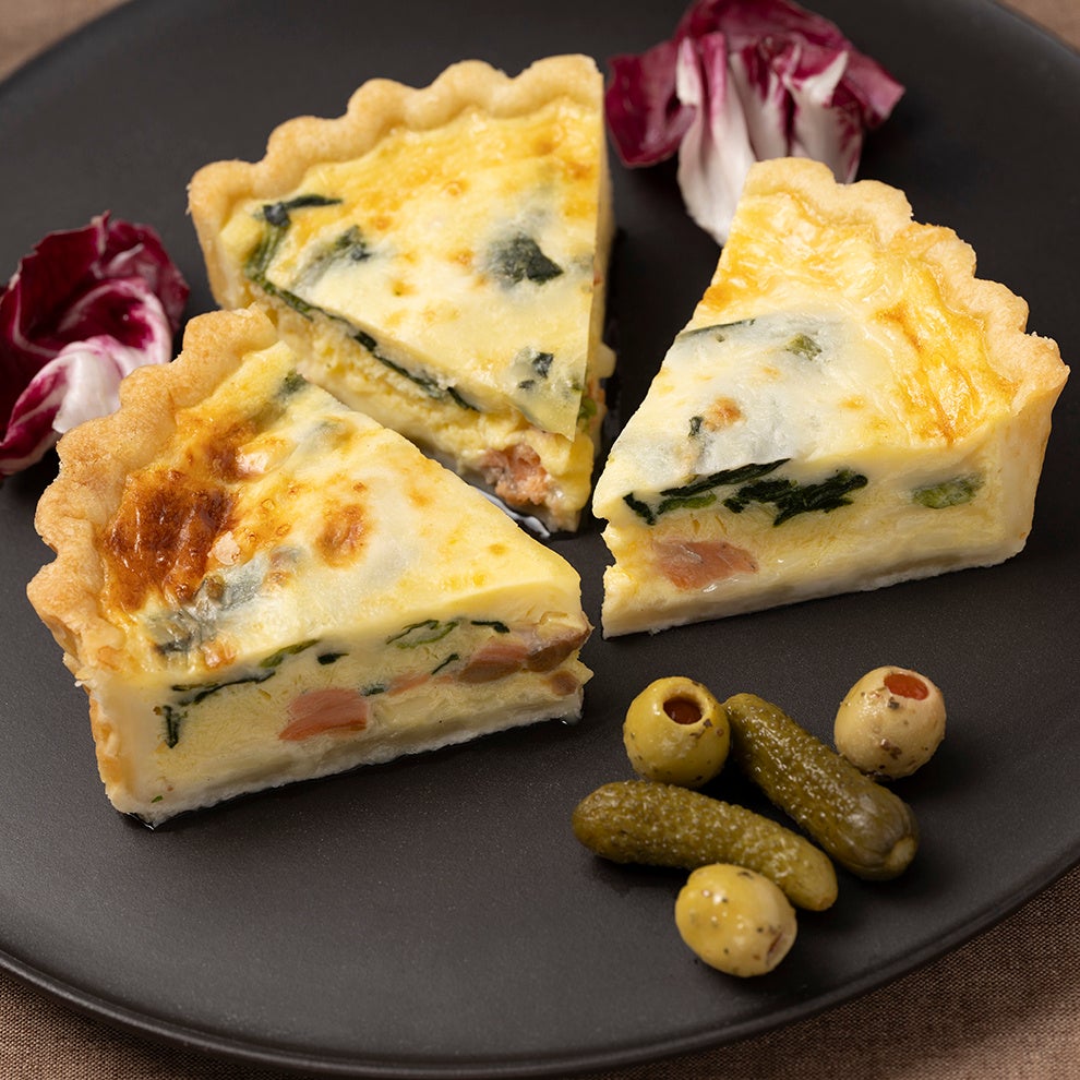 生地から一枚一枚手作りで、北海道産の食材にこだわって作られたキッシュはお店でも一番人気です。半解凍の状態で、お好みの大きさにカットして温めてお召しあがりください。