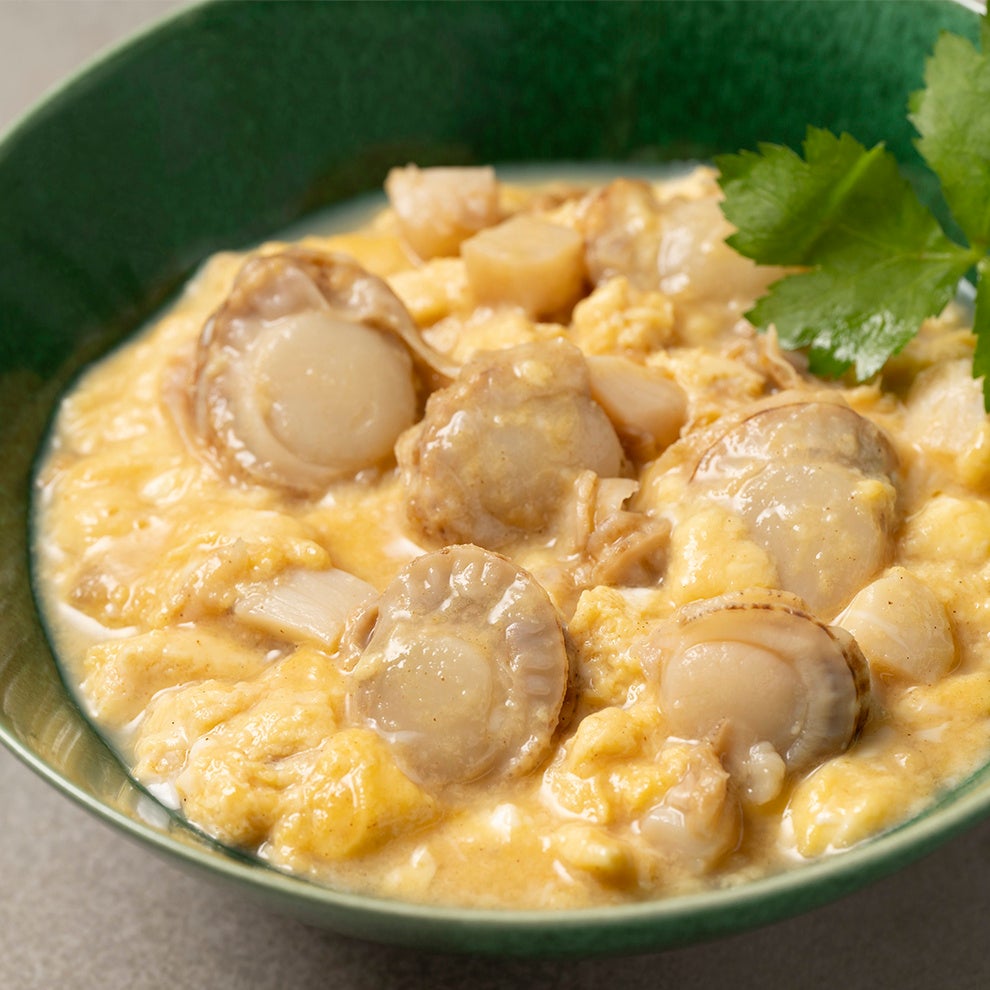 青森県産のホタテと津軽味噌、煮干し出汁が程よく融合しています。溶き卵を加える際に、お好みで少し長めにレンジで加熱して、固めに仕上げるのもオススメです!