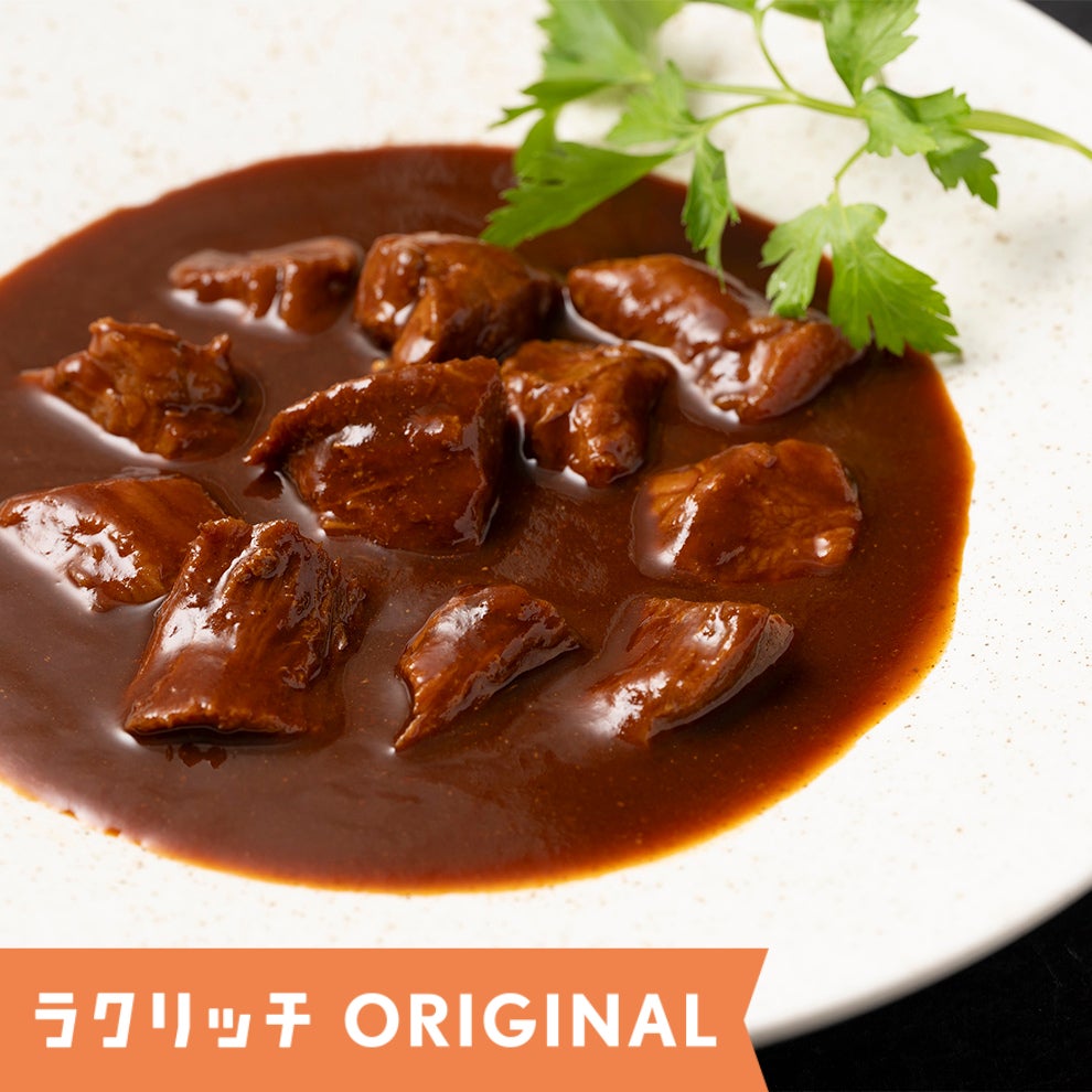 牛タンが贅沢にごろごろ入っています。じっくり煮込むことで、口にすると肉の繊維がほどけるほど柔らかくなっています。程よい酸味と深みのあるオリジナルブラウンベースソースと合わせることで、ほろほろ食感でコクのある、ラクリッチこだわりの一品に仕上げています。