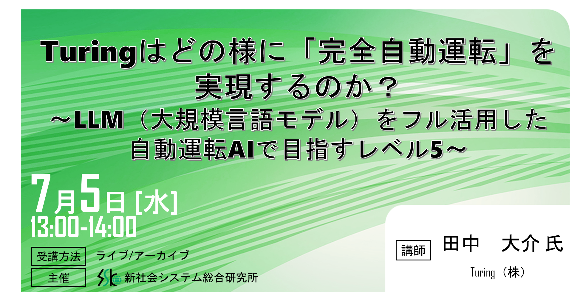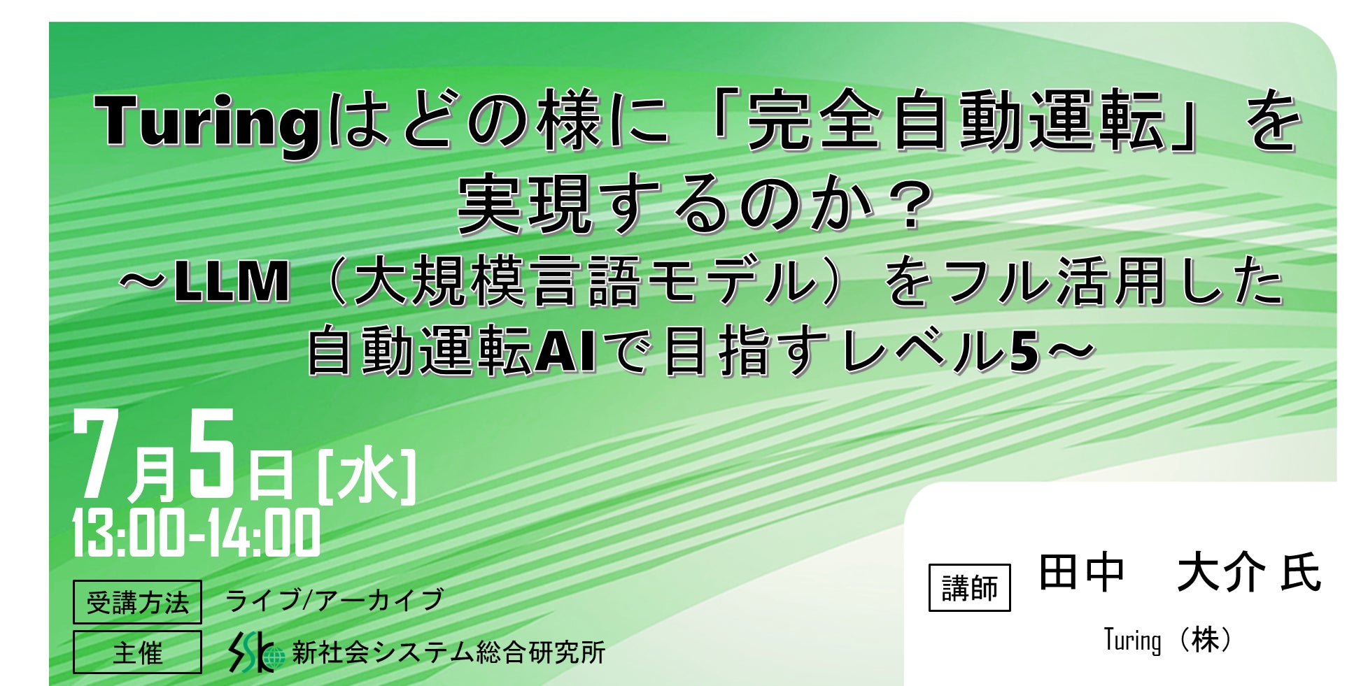 「どの様にレベル5を実現するのか?」と題して、Turing(株) 取締役COO 田中 大介 氏によるセミナーを2023年7月5日(水)に開催!!