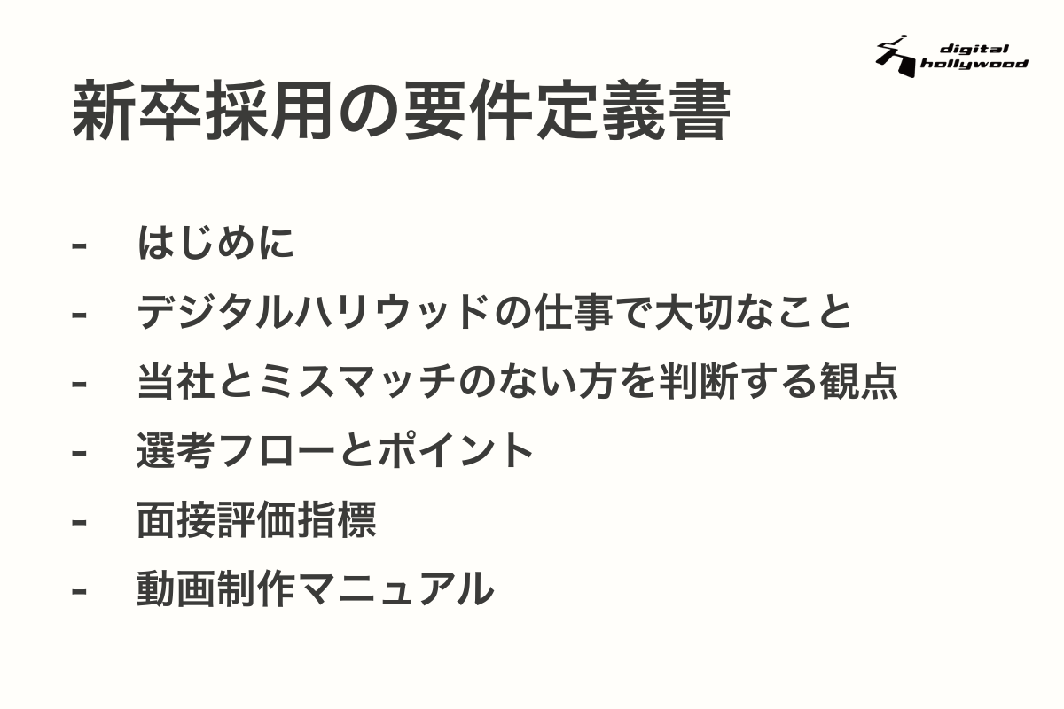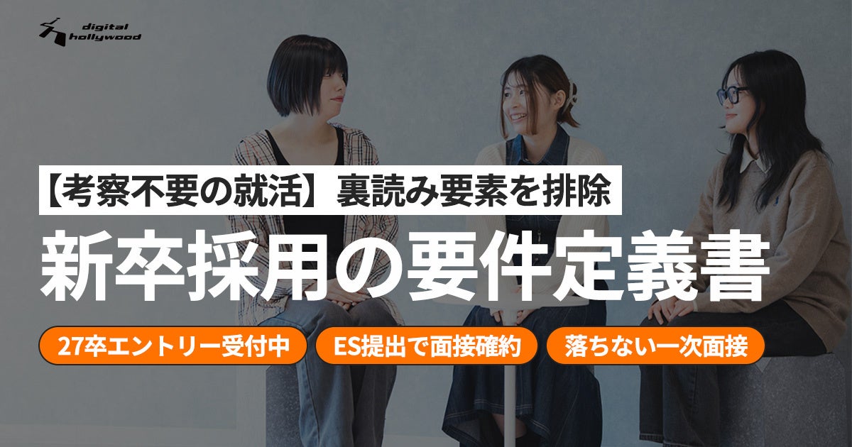 IT関連及びデジタルコンテンツの人材養成スクール・大学・大学院を展開するデジタルハリウッド株式会社 (本社/本校:東京都千代田区、代表取締役社長兼CEO:藤井雅徳、学長:杉山知之)は、新卒採用における選考フローの考え方と評価観点を整理した『新卒採用の要件定義書』を公開しました。