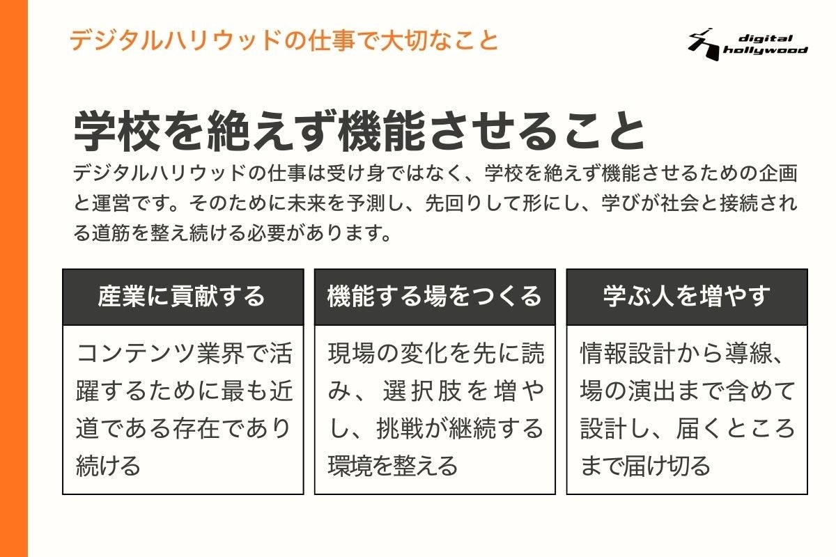 2004年には日本初、株式会社によるビジネス×ICT×クリエイティブの高度人材育成機関「デジタルハリウッド大学院(専門職)」、翌2005年4月に四年制大学「デジタルハリウッド大学」を開学。