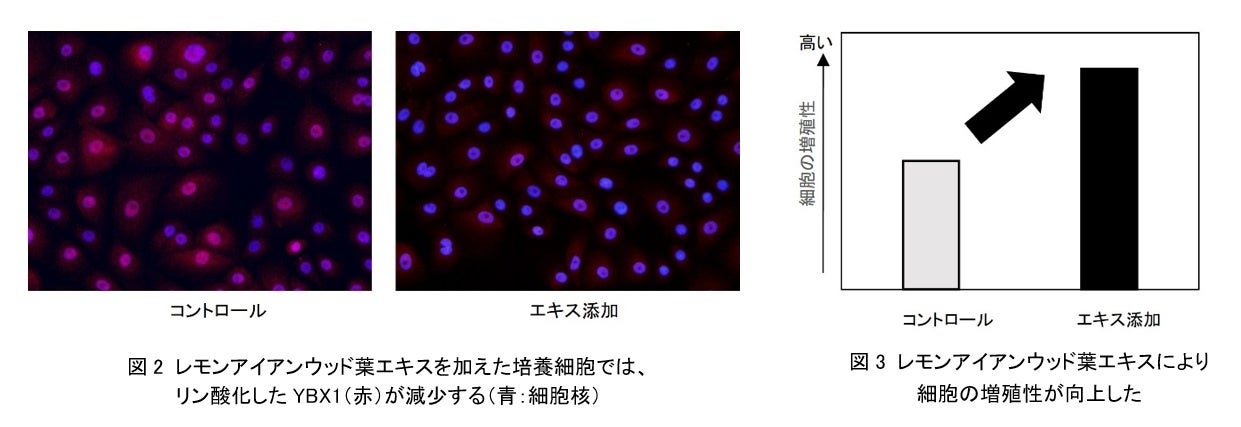 また、YBX1が表皮幹細胞の老化を防ぐメカニズムとしては、老化した細胞から分泌されて老化の伝播を引き起こすSASP因子の産生を抑制することが知られていますが、本研究では、レモンアイアンウッド葉エキスを添加した培養細胞で、SASP因子※7の一つであるIL-8※8の産生が抑えられていることがわかりました。加えて、レモンアイアンウッド葉エキスにより、表皮幹細胞のマーカー遺伝子であるMCSP※9の発現が増加し、細胞の増殖性も向上しました(図3)。このことから、レモンアイアンウッド葉エキスは表皮幹細胞の老化を抑制する効果を持つとともに、表皮幹細胞の量を増加させ、細胞を生みだす力を向上させる効果があることが示唆されました。
