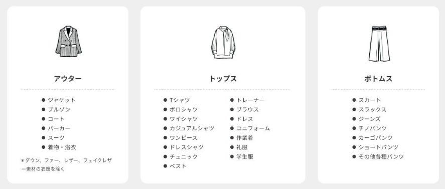 ・衣類は事前にお洗濯(もしくはクリーニング)をお願いいたします。汚れの著しいもの、濡れた状態のものはご遠慮ください。