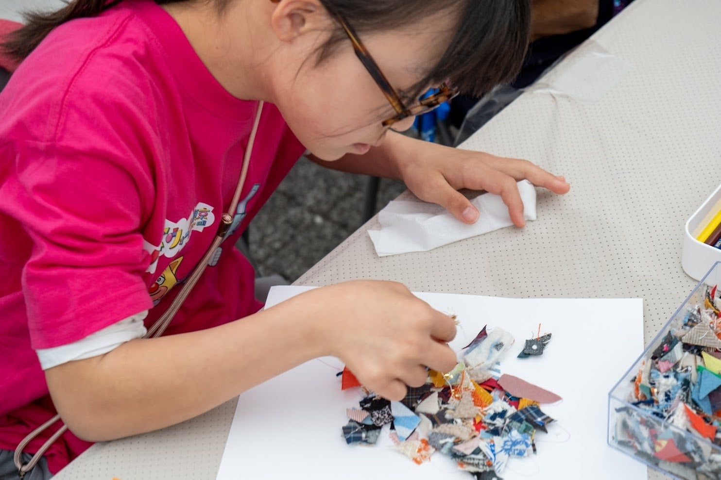 「Play fashion! for ALL」のブースでは、サステナブルな取り組みの一環として商品生産過程で余った残布を使用した手形アートワークショップを実施しました。個性あふれる残反の組み合わせにより、世界で一つだけの思い出に残るサステナブルなアート作品が出来上がりました。