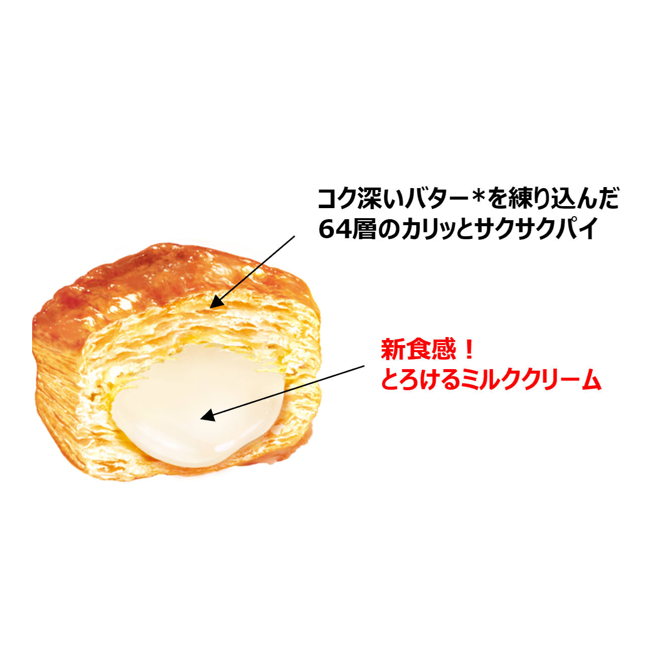 コク深いバター(*)を練り込んだ64層のサクサクパイに、とろけるミルククリームをとじ込めた一粒スイーツです。
