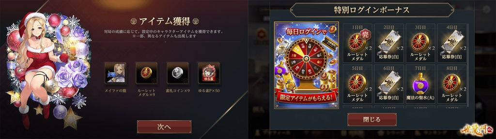 今回のイベントでは、イベント限定衣装の「メイファ:クリスマスver」を収集設定すると、対局報酬で獲得できるルーレットメダルの数が通常の3倍に増加します。