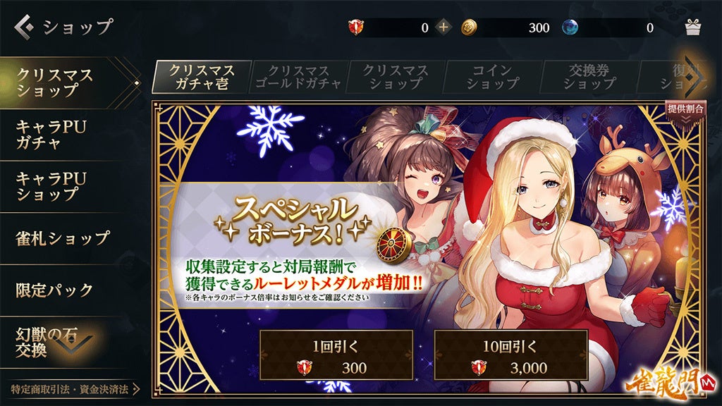 エヌ・シー・ジャパン株式会社(本社:東京都港区、代表取締役:林 元基(イム ウォンキ)、以下エヌシージャパン)は、PCとスマートフォン向け超美麗本格3D麻雀ゲーム『雀龍門M』にて、2024年12月4日(水)より「雀龍門M大抽選会」の開催決定と、11月27日(水)より「クリスマスイベント〜サンタ雀士と真剣勝負〜」の開催をお知らせします。
