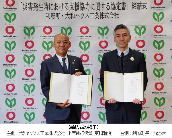 宮城県宮城郡利府町(町長:熊谷大(ゆたか)、以下「利府町」)と大和ハウス工業株式会社(本社:大阪市、社長:大友浩嗣、以下「大和ハウス工業」)は、本日(2026年4月15日)、「災害発生時における支援協力に関する協定書」を締結しました。