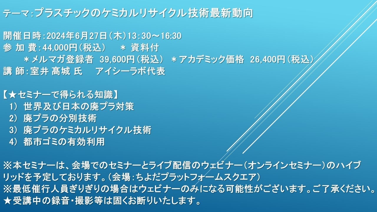 【会場/ライブ配信ハイブリッドセミナー】プラスチックのケミカルリサイクル技術最新動向 6月27日(木)開催 主催:(株)シーエムシー・リサーチ