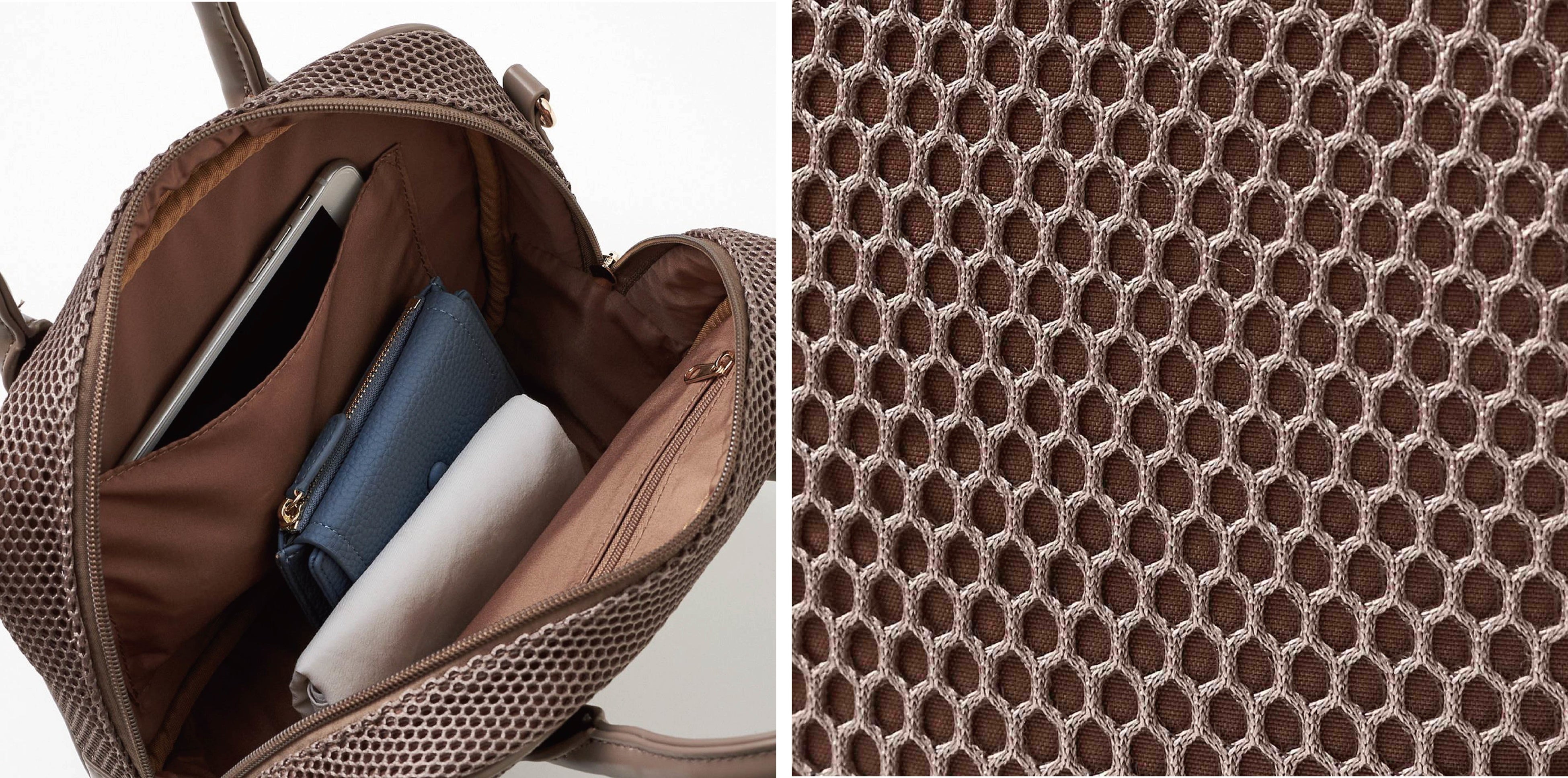 軽やかなメッシュ素材とフェイクレザーの組み合わせが新しいミニボストンバッグです。裏地があることで、中の荷物が透けずに、メッシュの軽やかな表情を楽しめます。 縦約19cm(持ち手含まず)、横約25cmと持ちやすいサイズが特徴です。丸みのある形状から、カジュアルにもきちんとしたスタイルにも、幅広く似合います。