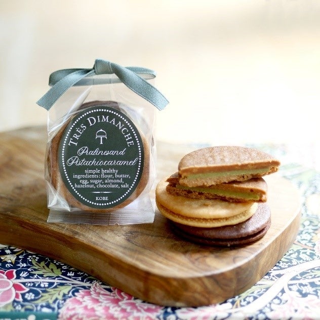 北海道産のバターと小麦を使用したサクサク香ばしいリッチなサブレ生地に、ヘーゼルナッツとアーモンドたっぷりの自家製プラリネを合わせたクリームをサンドしました。「プレーン」「ショコラ」ともう一種類の味をお好みでお選びいただけます。