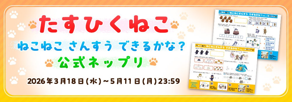 マイクロマガジン社 こどものほん編集部より発売中の算数絵本『たすひくねこ』の算数プリントが、2026年3月18日(水)10:00~5月11日(月)23:59までの期間限定で、プリント支援サービス「公式ネップリ」にてプリントできるコンテンツを提供いたします!