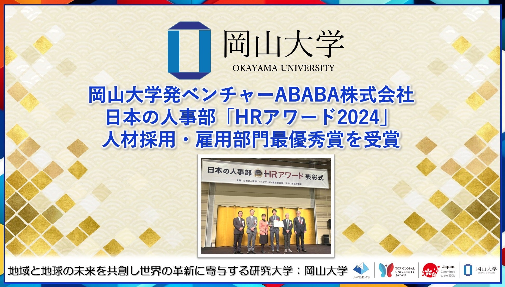 国立大学法人岡山大学(本部:岡山市北区、学長:那須保友)の岡山大学発ベンチャー認定企業ABABA株式会社は、2024年10月24日、日本の人事部「HRアワード2024」(主催:「HRアワード」運営委員会、後援:厚生労働省)において、人材採用・雇用部門 最優秀賞を受賞しました。