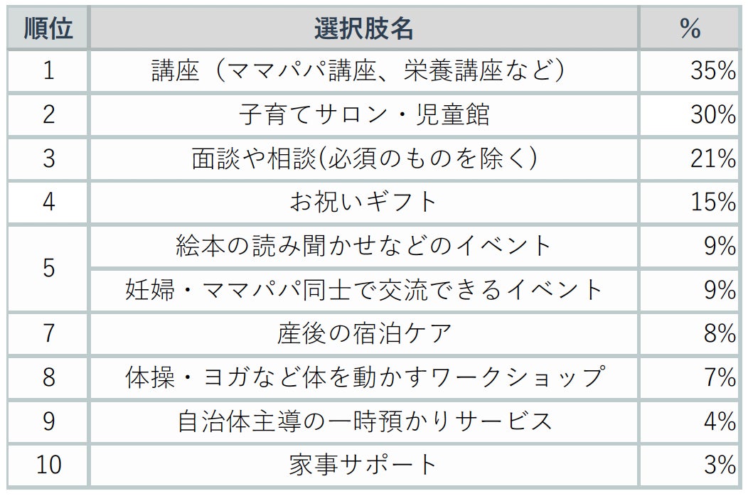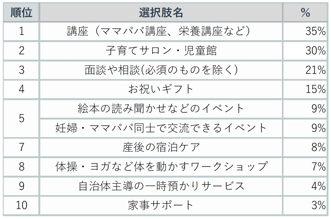実際に利用したサービス1位は「講座」で35%、2位「子育てサロン・児童館」で30%となりました。約3人に1人が利用しているものの、そもそもサービス内容を知らない、時間がないという声も。さらに、今回のアンケートは2歳以下のお子さんを持つママを対象としているため、コロナやその後の感染症流行の影響もありそうです。