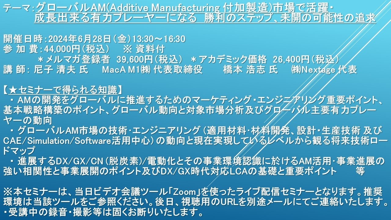 【ライブ配信セミナー】グローバルAM(付加製造)市場で活躍・成長出来る有力プレーヤーになる 勝利のステップ、未開の可能性の追求 6月28日(金)開催 主催:(株)シーエムシー・リサーチ