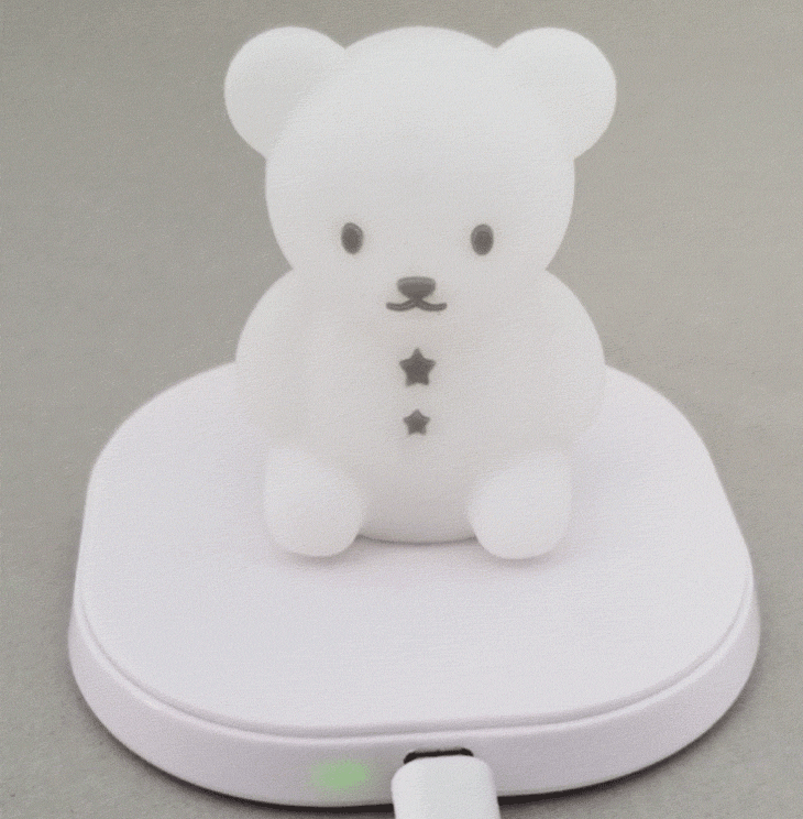 雑貨メーカー 株式会社ハシートップインからリリースされている、Qi対応ワイヤレス充電器付きのシリコン製の光るフィギュア「こぐまのおやすみライト(チャージアンド)」。