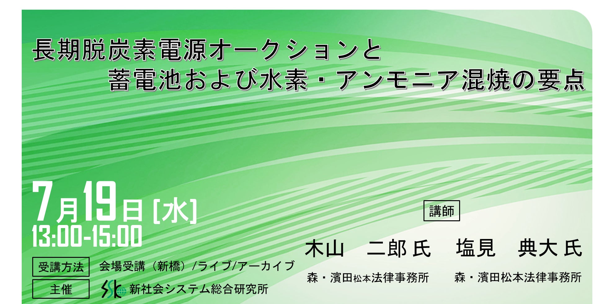 「長期脱炭素電源オークションと蓄電池水素アンモニア」と題して、森・濱田松本法律事務所 パートナー弁護士 木山 二郎 氏/弁護士 塩見 典大 氏によるセミナーを2023年7月19日(水)に開催!!