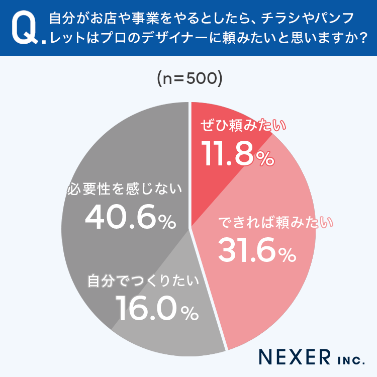 最後に、自分がお店や事業をやるとしたら、チラシやパンフレットをプロのデザイナーに頼みたいと思うか聞いてみました。