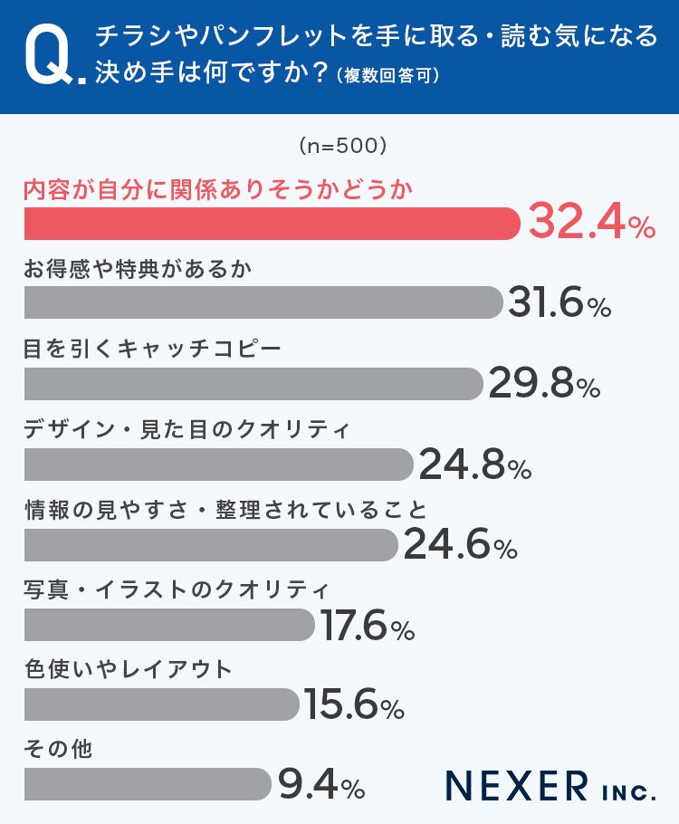 続いて、チラシやパンフレットを手に取ったり、読む気になったりする決め手は何かを聞いてみました。