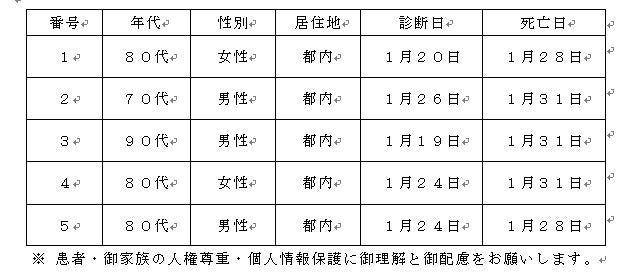 都内で新型コロナウイルスに感染した方が死亡されましたのでお知らせします。
