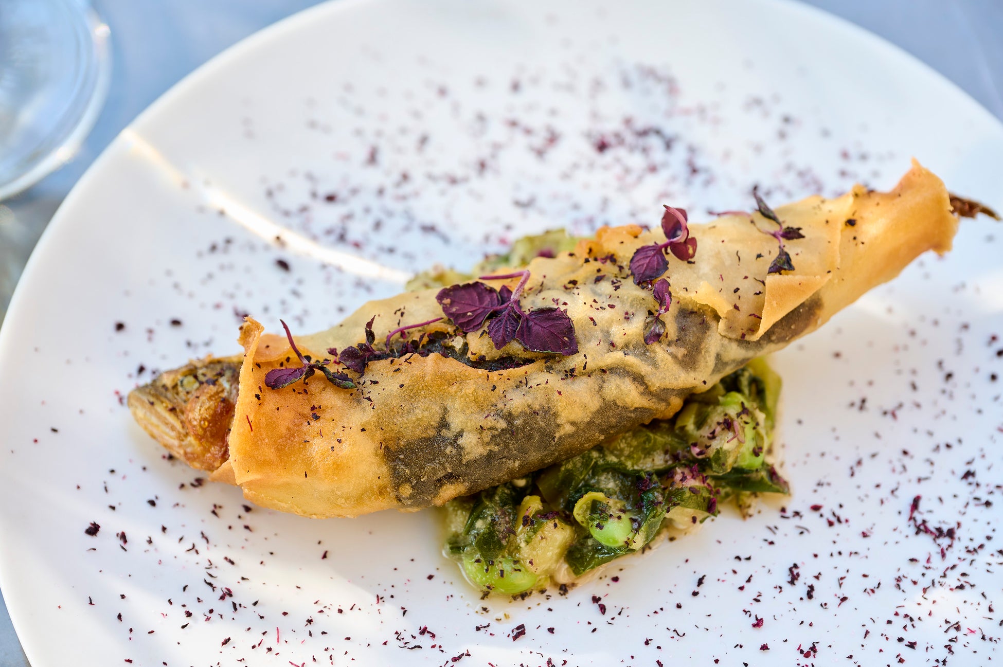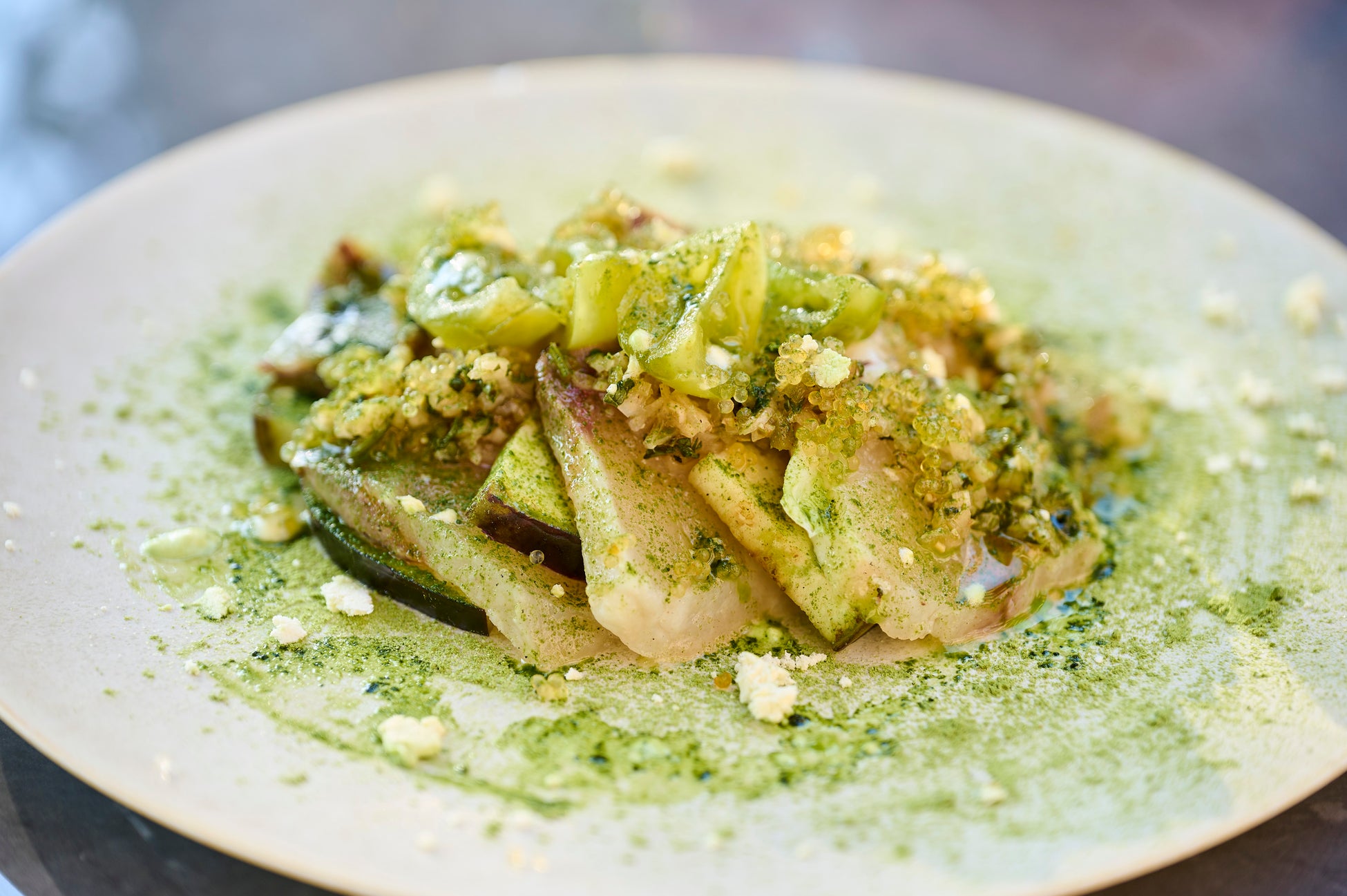 薪で火入れしたシマアジを桜チップで瞬間燻製したカルパッチョ。昆布茶や抹茶をMIXしたパウダーが新緑を思わせる爽やかなニュアンスを表現。とびっこや水ナスも加わり豊かな食感に。燻製の香りが食欲を掻き立てる初夏のご馳走です。