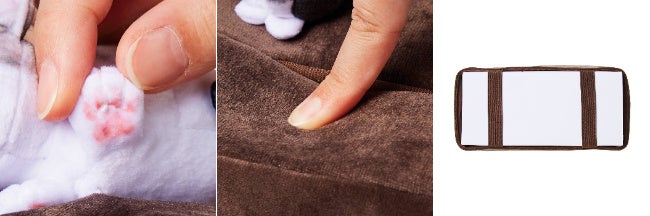 見えない足裏のむにっとした肉球まで細かく再現しています。カバー本体はお布団をイメージしたふかふか素材です。裏側のゴムベルトでティッシュケースをしっかり固定します。